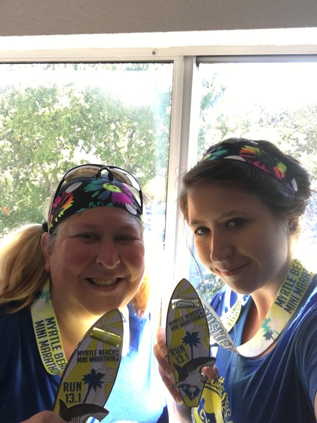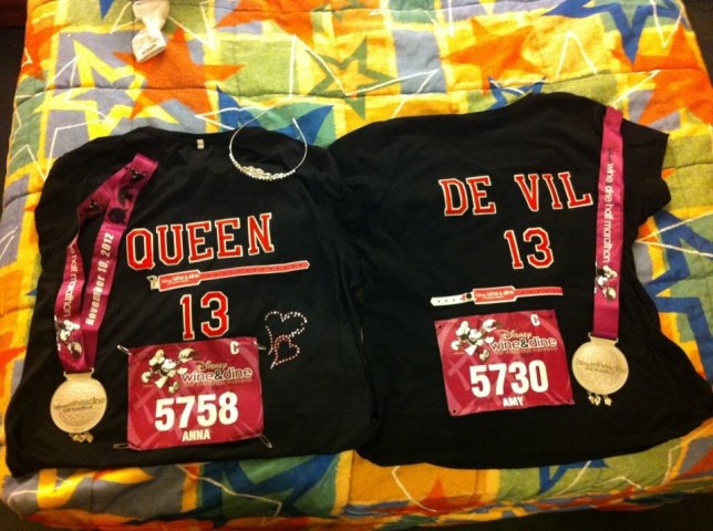 From there, we followed the same path we took to the parks toward Downtown Disney, past Sequoia Lodge and The New York Hotel, before going up, up, up, and over the bridge to the Newport Bay resort. I had reconnected with Patrice by this point, and she was staying here at Newport. Her roommate (who had already finished the half) was on her way back to the resort and ran the bridge with us – if she was still running, so should we, right? 😉 The finish was so close, and we stopped for photos at the 21k banner that was still being painted! We crossed the finish line together, received our medals and took photos of and with each other to send home, and parted ways – Patrice was so encouraging and great to run with!